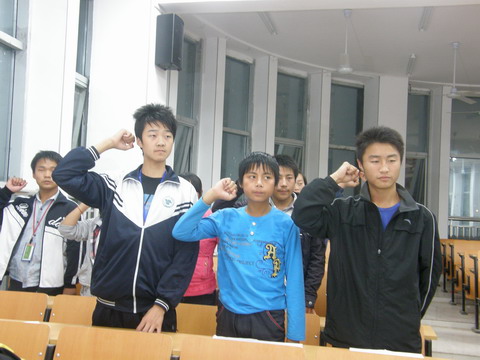 Photo Stories - September 2010 - Qingchuan First High School, Qingchuan Vocational High School 青川一中明天计划学生合影 A group photo of Tomorrow Program students (Qingchuan First High School)  勇敢地发言 Speak out bravely in front of the classmates  环保队员宣誓 Members of our environmental protection team are taking an oath  何潇露、简阿姨、杨小艳(左起)在青川职高新校园门口 The new campus of Qingchuan Vocational High School (the center is Tomorrow COO Tricia Lin)  从关庄中学考上青川一中/青川职高的倪德发、杨小艳、李伟、何潇露(左起)与简阿姨合影 High school freshmen from Guanzhuang Middle School  青川一中的新校园 The new campus of Qingchuan First High School  半年不见的高中生都长高了 Students have grown taller within the last 6 months  学生们初到离家很远的青川一中,心里还有些不安 The new Qingchuan First High School is so far away from their home town, the students will need quite a while to adjust to the new conditions  |