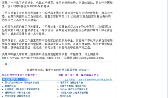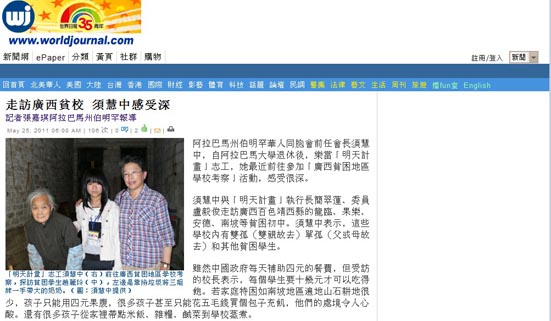 2011-5-26   走访广西贫校 须慧中感受深 世界新闻网-北美华文新闻、华商资讯 记者张嘉琪亚拉巴马州伯明翰报导 05.25.11 - 06:00 am 亚拉巴马州伯明翰华人同胞会前任会长须慧中,自阿拉巴马大学退休后,乐当「明天计划」志工,她最近前往参加「广西贫困地区学校考察」活动,感受很深。 须慧中与「明天计划」执行长简翠莲、委员卢毅俊走访广西百色靖西县的龙临、果乐、安德、南坡等贫困初中。须慧中表示,这些学校内有双孤(双亲故去)单孤(父或母故去)和其它贫困学生。 虽然中国政府每天补助四元的餐费,但受访的校长表示,每个学生要十几元才可以吃得饱。若家庭特困如南坡地区遍地山石耕地很少,孩子只能用四元果腹,很多孩子甚至只能花五毛钱买个包子充饥,他们的处境令人心酸。还有很多孩子从家里带点米饭、杂粮、咸菜到学校蒸煮。 须慧中一行除了送助学金,也做心理辅导,希望能通过校长、老师的协助,再收些特 › 学生,从9月开始作全方面的助学和辅导。 「明天计划」是由北京大学陈十一教授和美国洛杉矶加州大学何志明教授发起,由来自大陆、台湾和美国的志工自发组成。计划旨在帮助四川5.12地震灾区及国家级贫困县的特困初中生及高中生完成学业。 简翠莲表示,此行工作最重要的不但是家访或发放助学金,而且每年春秋两次亲自前往每个学校讲解生命教育和持续关怀,教导学生做人的道理、正确的价值观、如何面对与解决问题,让学生真正受益,这也是「明天计划」与任何助学组织不同之处。 须慧中呼吁大家能伸出援手协助这些处境艰难的孩童,有关详情,可上网查阅:http://www.tomorrowcn.org/index.asp ,或联络whsuus@yahoo.com。 报导原文地址:世界新闻网 http://worldjournal.com/bookmark/13392856 备注:世界新闻网为境外网站,需使用在线网页代理(web proxy)方能正常浏览报导内容。 |