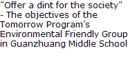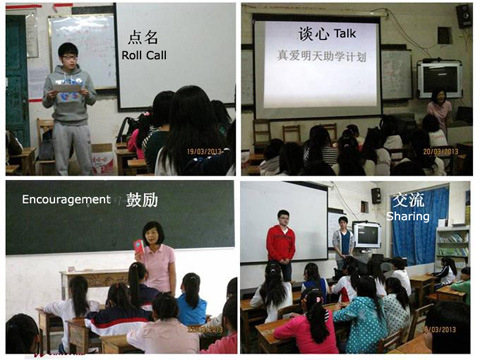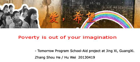 • Impressions from the Education Assistance Trip in Jingxi County of Guanxi Province – Volunteer Xu Yujia from the Beihai College of Beihang University, March 2014 On March 22, along with my fellow volunteer Yao Bin, I participated in the education assistance trip of the “Tomorrow Program” to Longlin and Guole Middle School of Jingxi County, Guanxi Province led by Mrs. Tricia Lin. On the way from Beihai to Jingxi County, I was deeply touched by the beauty of the natural scenery. The humble dwellings I saw along the way reminded me of the children living in the remote mountainsides. Due to difficulties with transportation, many of these areas remain isolated from the outside world. The people are honest and humble, living simple lives. Everything seemed so fresh and lively. After we met up with Auntie Jane, she described the current condition of the program, and explained in detail things of which we should be aware. During this discussion, I could feel clearly the importance she placed on this activity. She asked the volunteers to be sensitive, to be aware, to fully respect the children’s self-esteem, and to protect their feelings. We were there to provide appropriate and suitable help to the children, not to let the children become dependent on us. The children must be independent and optimistic like their other classmates. They must face their schooling and their lives with a healthy attitude. Longlin Middle School – The Lively Optimism of the Children is Worth of Admiration After we reached the classroom, the children came forth to greet Auntie Jane warmly - Those kids always call her Auntie Jian, with bright smiles on their faces. I felt as if the room was covered in warm, brilliant sunshine. Auntie Jane greeted the children warmly back. The scene was like that from a long-awaited family reunion. Auntie Jane asked about the children’s living situations. Due to the exceptionally cold winter of 2013, Auntie Jane was worried for the children. After hearing that the children were fine, she relaxed and began her speech. Auntie Jane told the children a story about “The Eagle and the Chicken”. She told them that they were eagles that would soar high above in the skies. Even though the feathers in their wings had yet to be fully grown, they would take flight one day and achieve amazing things. The children listened with rapt attention. From their eyes, I could see their determination and secret resolve. They wrote down everything that Auntie Jane said. The goal of the “Tomorrow Program” is not only to deliver education assistance to these children, but for Auntie Jane to answer their questions about life and about learning, in order to ease their worries. In consideration of the shy nature of the kids, and in order to protect their self-esteem, Auntie Jane asked the children to write their questions anonymously on pieces of paper. We sorted the questions, and Auntie Jane answered them one by one. Among the questions, one touched all of us who were present. The question asked, “Auntie Jian, if I do not get accepted to high school, will you guys be disappointed? Would you feel that you had wasted a scholarship on me?” This question came from a child barely in their teens, because they wanted to be loved and to be cared for, yet they were afraid that if they were not good enough, the people who cared about them would be disappointed. Auntie Jane assured the children. None of the scholarships would ever be wasted. Love is never wasted. Every child who lives in poverty deserves our help, regardless of whether they’d pass the high school entrance exams and enter an ideal school. At the same time, Auntie Jane explained to the children the details about vocational secondary schools. For the children who do not get accepted into their ideal high schools, this would be another possible path for them to continue their learning. Auntie Jane told the children her dreams for each of them, “Do you utmost to be the best person that you can be.” At this meeting, Auntie Jane asked Yao Bin and me to introduce ourselves and to encourage the children. Yao Bin shared the personal experience of his friend as an inspiration story. He encouraged the children to be courageous, to face life proactively, and to be earnest in their studies. I chose the English proverb, “It is never too late to become the person you want to be”, but unexpectedly made a mistake with the grammar. Auntie Jane used this as an opportunity to give the children an English lesson. From the sentence structure, to the English word structure, to the spelling and ways to memorize it, she gave constructive suggestions to the children to help them learn English more easily, and to cultivate their interest in learning English. The students actively interacted with Auntie Jane. I could see that they had understood her, and taken her suggestions of learning English to heart. They were not so afraid of learning English anymore. A lively child asked Auntie Jane, “How can we better focus during class?” Auntie Jane smiled. She knew that children were often distracted during class. She asked all of the children to look into her eyes. Many of the children were too shy to do so, but with her patient explanation, the children gradually began to look. They paid careful attention to everything she said. They promised her that they would pay attention and study diligently. The two hours flew by all too quickly, and it was time for recess. With great sadness and longing, the children said goodbye with tears in their eyes. Auntie Jian promised to visit again next semester. Guole Middle School Home Visits: A journey filled with sadness revealed Auntie Jane’s immense inner strength and taught us how to be mindful in caring for the children In the afternoon, accompanied by the principal and the teacher responsible for conducting home visits, we went to the home of two orphans. The children came along with us. The uneven and trea